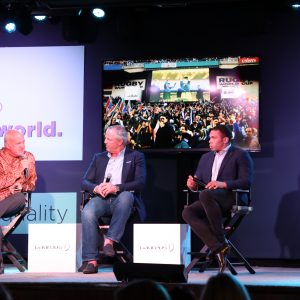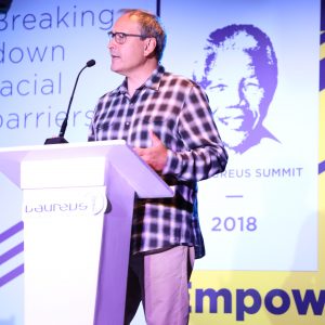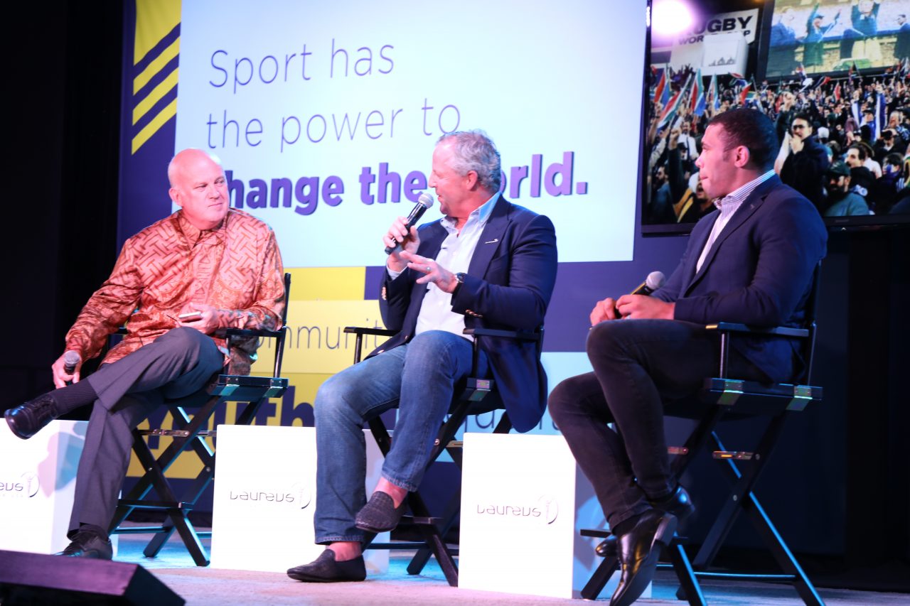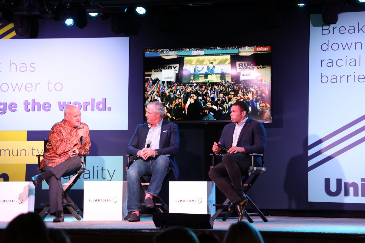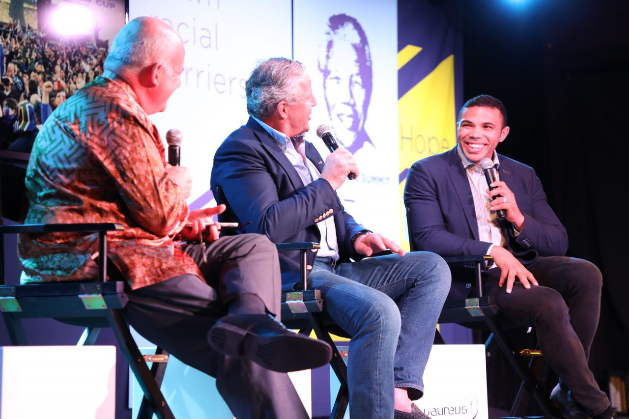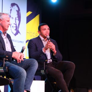 Intro: Welcome video from Kweku Mandela (Nelson Mandela’s grandson) | Conversation between Sean Fitzpatrick (captain of the All Blacks in 1995) and Bryan Habana (South African rugby player) about the 1995 Rugby World Cup | Moderator: Neill Duffy, Purpose + Sport.